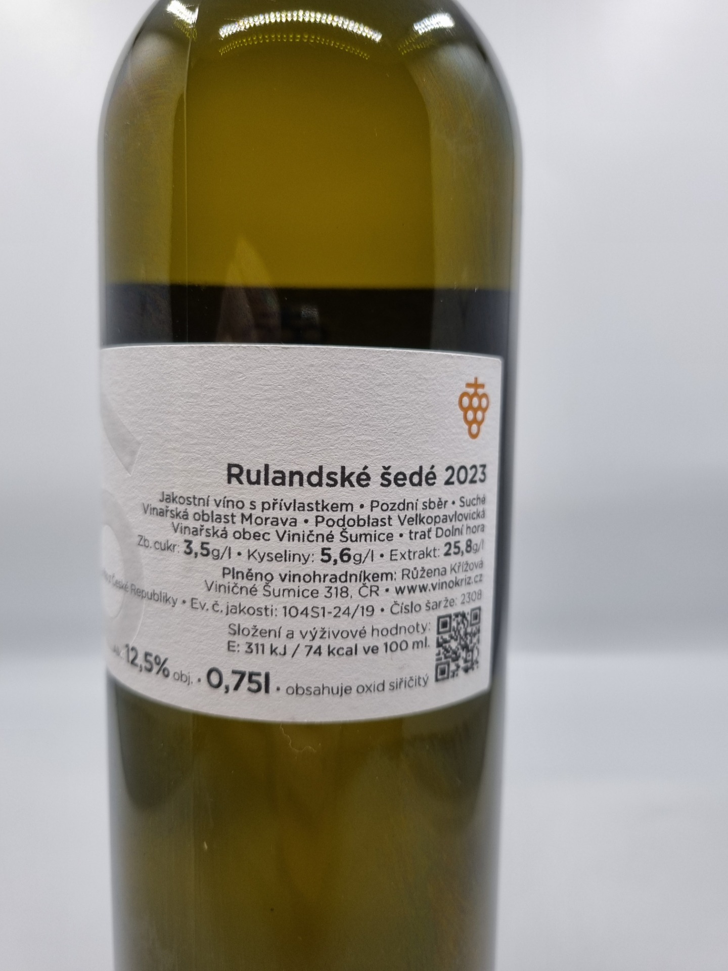 Jakostní víno s přívlastkem pozdní sběr,suché, cukernatost hroznů 21°,zb.cukr 3,5g/l, kyseliny 6g/l, bezcukerný extrakt 25,8g/l